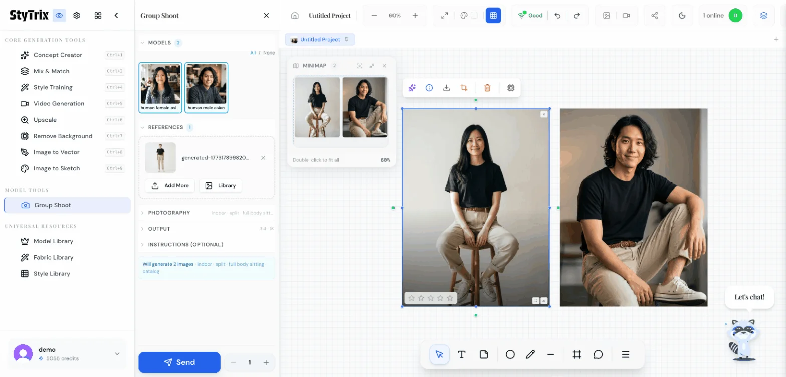 - Use the Photography section to control environment (indoor/outdoor), composition (split/centered), pose (standing/sitting/walking), and style (catalog/editorial/lifestyle)