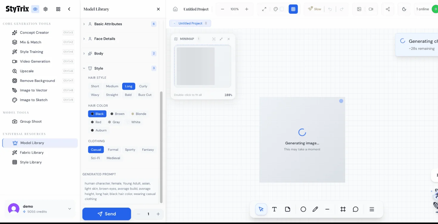 Click the Send button to generate your custom model. The AI will process all your attribute selections and create a photorealistic model image in approximately 20–30 seconds.